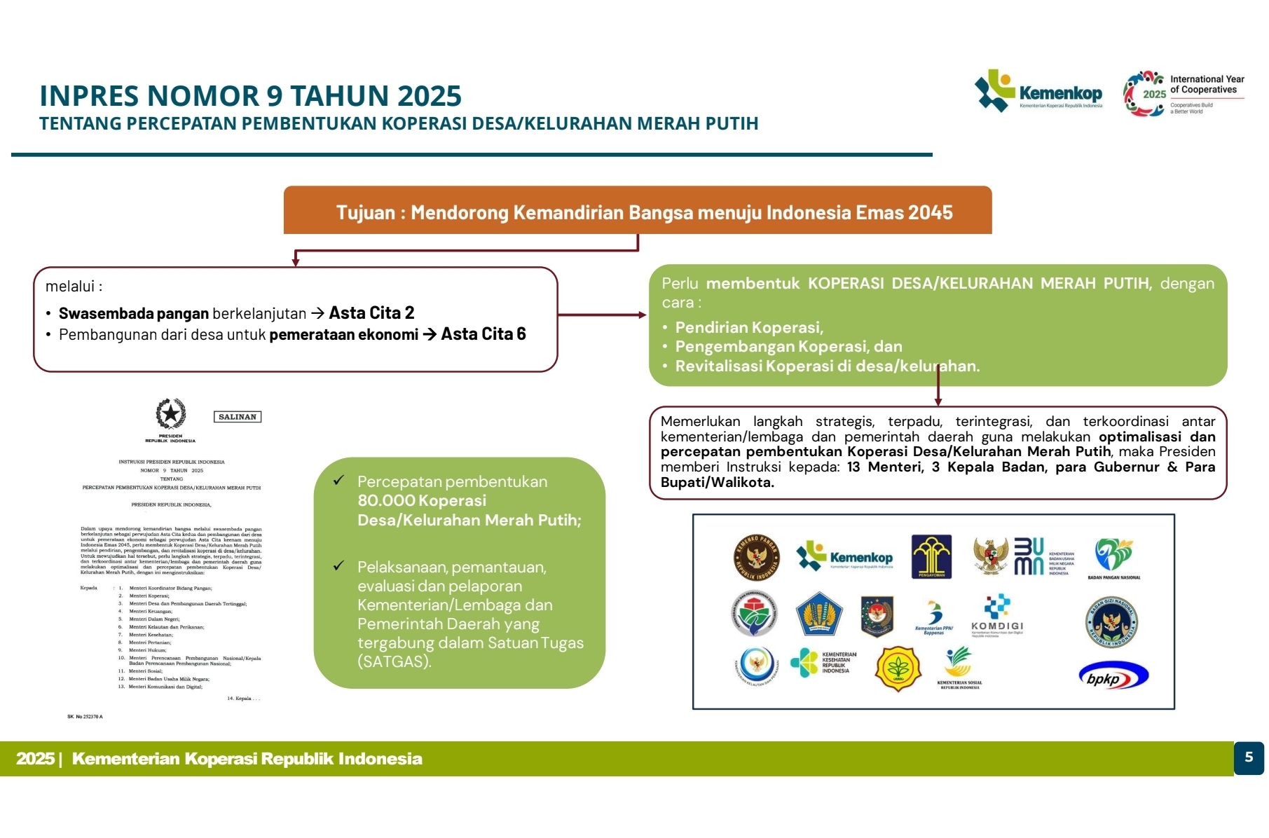 Instruksi Presiden Nomor 9 Tahun 2025 tentang Percepatan Pembentukan Koperasi Desa/Kelurahan Merah Putih merupakan kebijakan strategis nasional yang menargetkan pembentukan 80 ribu koperasi desa di seluruh Indonesia.Kebijakan ini diarahkan untuk: